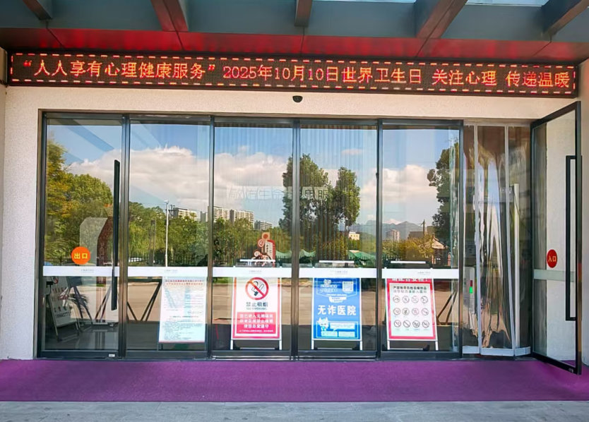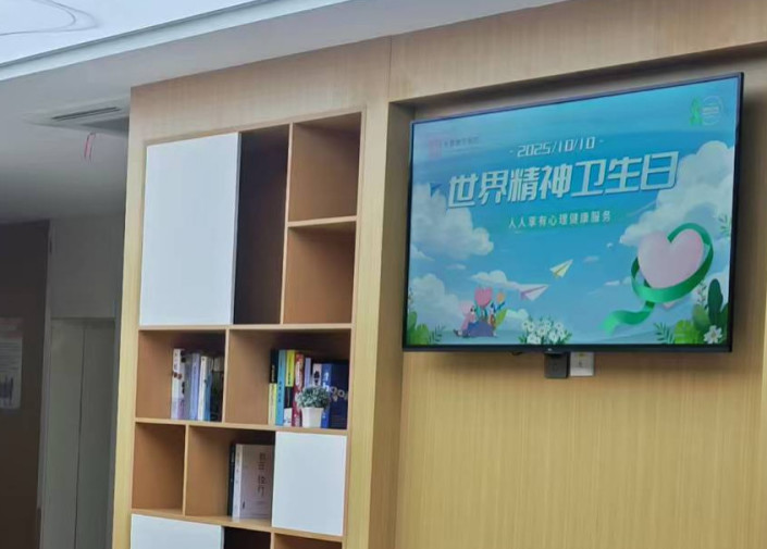 在医院院区,浓厚的宣传氛围传递着心理健康关怀。院内悬挂的主题横幅清晰醒目,LED显示屏及电视屏幕循环播放精神卫生科普知识、服务流程等宣传内容 ,全方位解读“人人享有心理健康服务”的核心内涵,引导公众正确认识心理问题,消除社会歧视,增进理解,共同推进精神卫生事业高质量发展。