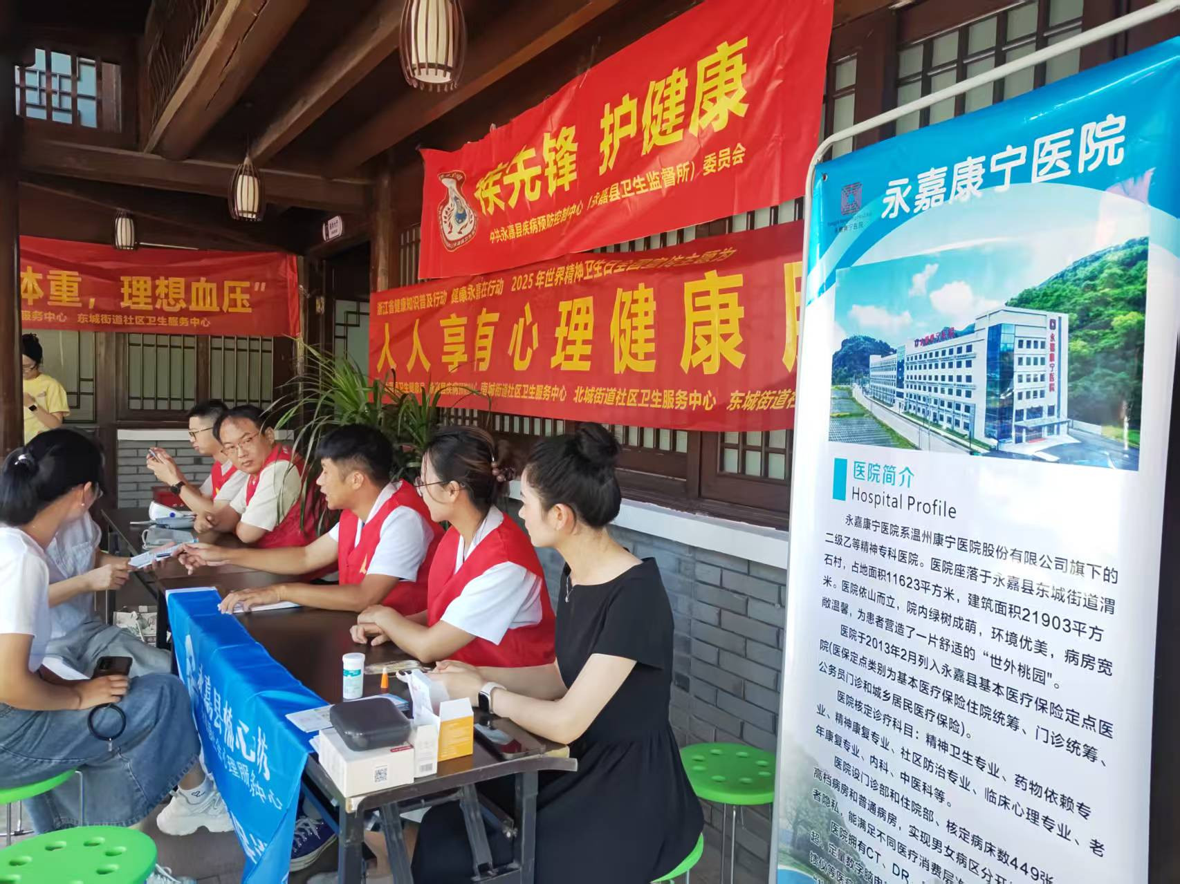 永嘉康宁医院是一家二级乙等的精神病专科医院,积极延伸服务触角,医院组建专业团队走出院区,在县城中塘溪公园开展大型义诊活动。特制精神卫生科普内容展板开展宣传,为市民提供免费血糖检测、血压测量等基础健康服务,同时开展精神科医生现场专业心理测评与咨询,耐心解答情绪调节、心理困扰应对等问题,将生理健康筛查与心理健康服务有机结合。活动现场秩序井然,医护人员的专业素养与贴心服务获得市民广泛认可,大家纷纷表示此类活动“接地气、有实效”。
